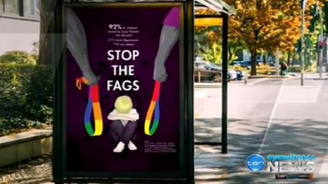 There’s no need to rehash the story here about how one poster in a Melbourne laneway allegedly spotted by a friend of a gay activist lead to reports the city’s walls had been plastered with homophobic hate-sheets — to such an extent that Channel 10 had to fake up an example. Media Watch did that perfectly well on Monday night, as has advertising bible B&T (although it’s worth noting that three Channel Nine journos involved in faking a live cross to the network’s chopper in Queensland back in 2011 were fired the news director for the state resigned).
