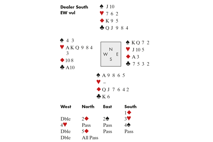 Ed Jones (W) doubled 1♦ as he was too strong for a simple overcall. Dennis (N) raised, and Tom (E) bid 2♠. So far so normal. But Zia knew hearts were about to be bid on his left. So he bid 3♥ himself! Poor Ed had no choice but to bid 4♥, knowing it sounded like a cue bid but hoping for the best. Tom alerted the bid, and Ed went pale. But then Tom began thinking… ‘If it was anyone else,’ he muttered glancing at Zia. He knew Zia too well: he removed his alert card, said the bid was probably natural, and passed. Zia now tried 4♠ and finally alighted in 5♦, doubled, down one — the same result as the other room. Incidentally, soon afterwards he gave Tom a lift back to London. Zia is a surprisingly slow driver, as I’ve experienced myself in the past At one point, Tom mentioned that his car was being overtaken by a hearse. Strange to be so aggressive in the bidding and so meek behind the wheel!