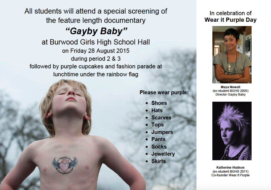 Two years ago, in late August 2015, I witnessed a ‘straw in the wind.’ I received an email that included the flyer below. It announced that all students at Burwood Girls High School in the inner-west of Sydney were required to attend a special film, Gayby Baby.