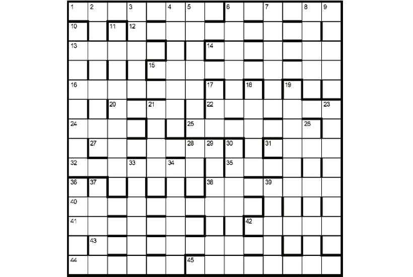 Unclued lights suggest nine different words, each made up of the same five letters. These letters will appear in the completed grid in an alphabetically ordered sequence which must be shaded. Elsewhere, ignore an accent.