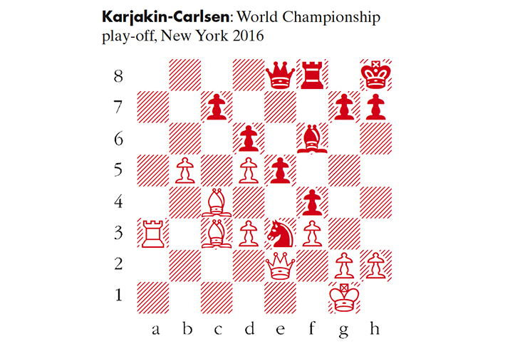 This week’s extract of play is taken from a new book on the championship between Magnus Carlsen and Sergei Karjakin from New York last year. The initial 12 games concluded with honours even, but the world champion went on to triumph 3-1 in the play-off. What follows was the first crack in Karjakin’s armour in the shoot-out games.