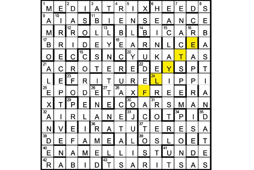 The suggested title is Brideshead Revisited, HEEDS/RABID (6A/42) being an anagram of BRIDESHEAD. The six characters, all members of the Flyte family, are ALEXANDER (Lord Marchmain) (21D), TERESA (Lady Marchmain) (37), and their children, BRIDEY (17), SEBASTIAN (8), JULIA (33) and CORDELIA (19). FLYTE (diagonally from the eighth row) was to be shaded.