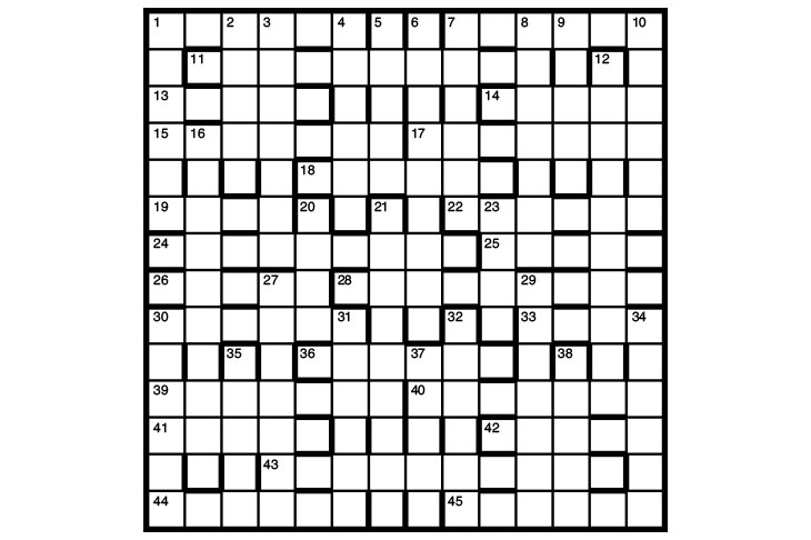 A first prize of £30 for the first correct solution opened on 2 January. There are two runners-up prizes of £20. (UK solvers can choose to receive the latest edition of the Chambers dictionary instead of cash—ring the word ‘dictionary’.) Entries to: Crossword 2338, The Spectator, 22 Old Queen Street, London SW1H 9HP. Please allow six weeks for prize delivery.