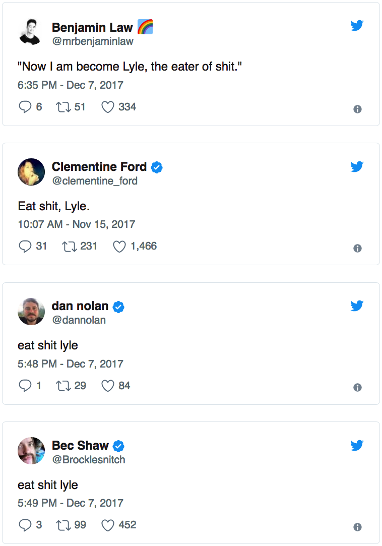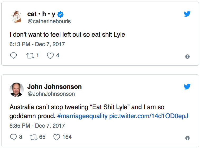 So, marriage equality finally passed parliament! And when it did, everyone on Twitter had a simple message for for [sic. They’re not great with grammar, let alone editing, over at Junkee.] Australian Christian Lobby Managing Director Lyle Shelton: Eat shit, Lyle.