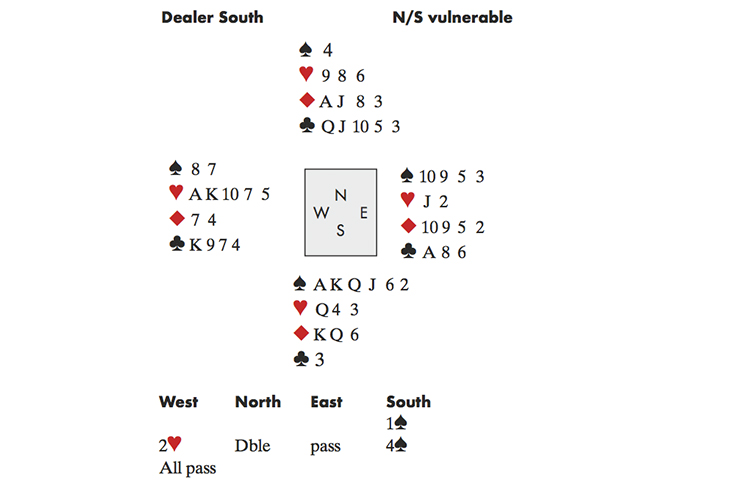 Sitting West, I led the ♥K. Normally, the king asks partner to give ‘count’ in the suit — but some people prefer to give ‘attitude’ signals, and my partner thought that’s what we’d agreed. So on my ♥K he played the ♥2 (‘reverse’ attitude: encouraging). I continued with the ♥A. My partner followed with the ♥J, and South (Tim), with no hesitation whatsoever, played his ♥Q! Clearly, he was the only one who knew what was going on. Now, convinced that my partner had started with ♥J42, I assumed the ♥J was a suit-pretence signal, showing the ♦K. It was vital, then, to switch to a diamond. If I played my winning ♥10, declarer might ruff, draw trumps and play ♣A and another club for a diamond discard. Of course that was exactly what Tim wanted: he won the diamond in hand, drew trumps, and discarded his club on the fourth diamond.