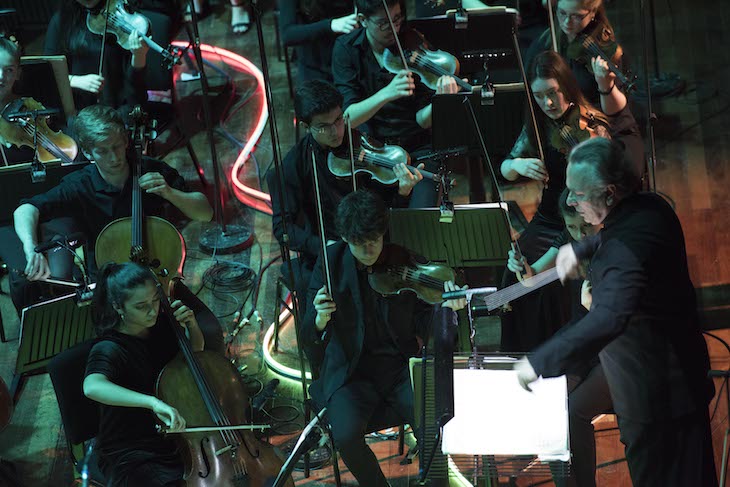 It was a neat idea, then, for director Daisy Evans to make the orchestra into a character in the NYO’s concert staging of Bartok’s Duke Bluebeard’s Castle, namely the massive, semi-sentient presence of the Castle itself. The stage directions ask for it to give ‘a cavernous sigh, like night winds’, so Evans had the orchestra’s members produce the sound themselves, with hands over mouths. Neon cables snaked between the players’ chairs, glowing blue for tears, yellow for gold or red for blood. Robert Hayward as Bluebeard repeatedly turned and surveyed the immense forces behind him, shoulders slumping, and when the Third Door revealed his treasure-chamber, players lifted their instruments up to glint and sparkle in the coloured light. The surtitles were accompanied by drawings of doors by Chris Riddell, and unnamed members of the National Youth Theatre enthusiastically declaimed the opera’s spoken prologue.