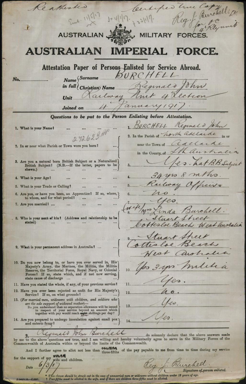 Reginald Burchell’s enlistment form, stating his calling as Railway Officer/National Archives of Australia.