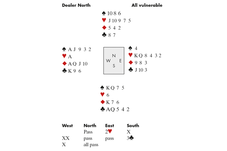 It looks like a totally normal T/O double by South — or does it? West led A, saw dummy’s three spades and played ♠A, expecting a singleton in partner’s hand. Next came ♠2 (asking for a diamond return) ruffed by East who dutifully returned a diamond. West won, shot back another small spade (ruffed), and waited for another diamond. He won, cashed his third diamond and exited yet another spade, ruffed in dummy and overruffed by East, who returned a heart, leaving West with another two trump tricks. Six off. Minus 1700. ‘Same result at the other table,’ said North sympathetically. Sadly not. A jaded South decided not to double as his partner was a passed hand and West bid 4which was a tricky make. Bet he didn’t expect to lose 14 IMPs on his careful play! Happy Easter.