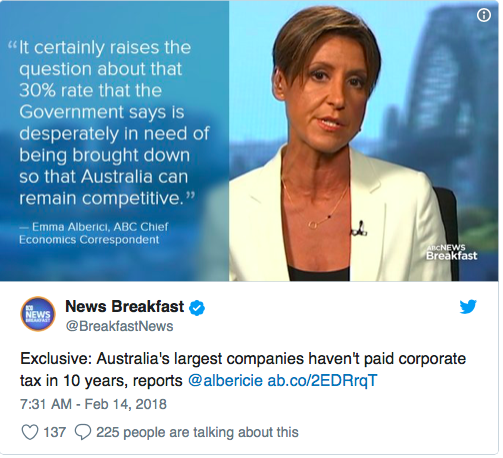This coverage contains multiple factual errors and misrepresentations in breach of the ABC’s editorial standards. It is neither fair, balanced, accurate nor impartial. It fails to present a balance of views on the corporate tax policy…