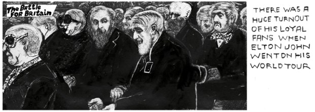 Barry Humphries tells me that being funny is now a dangerous business. I was asked to talk to some students about being a cartoonist. Little did I know that they thought my cartoons ‘confrontational’. I sometimes take the mickey out of women, and as a man this was not my prerogative, they told me. Thinking on my feet, I recanted, saying that I was not quite myself and had recently had a sex change. Oddly, they were happy with this answer. They seemed to take it quite seriously and allowed me to carry on talking about how trying to be funny tears your guts out.