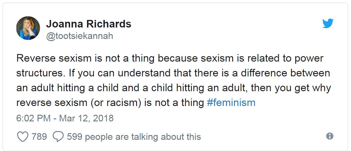 So, if you discriminate against, exclude, say mean things to and generally are nasty to men and white people you’re not being sexist and racist because well, men and white people deserve it on the account of their privilege and power superiority, and women and other races can be completely excused for lashing out against those people. The rage of the oppressed is righteous and justifiable.
