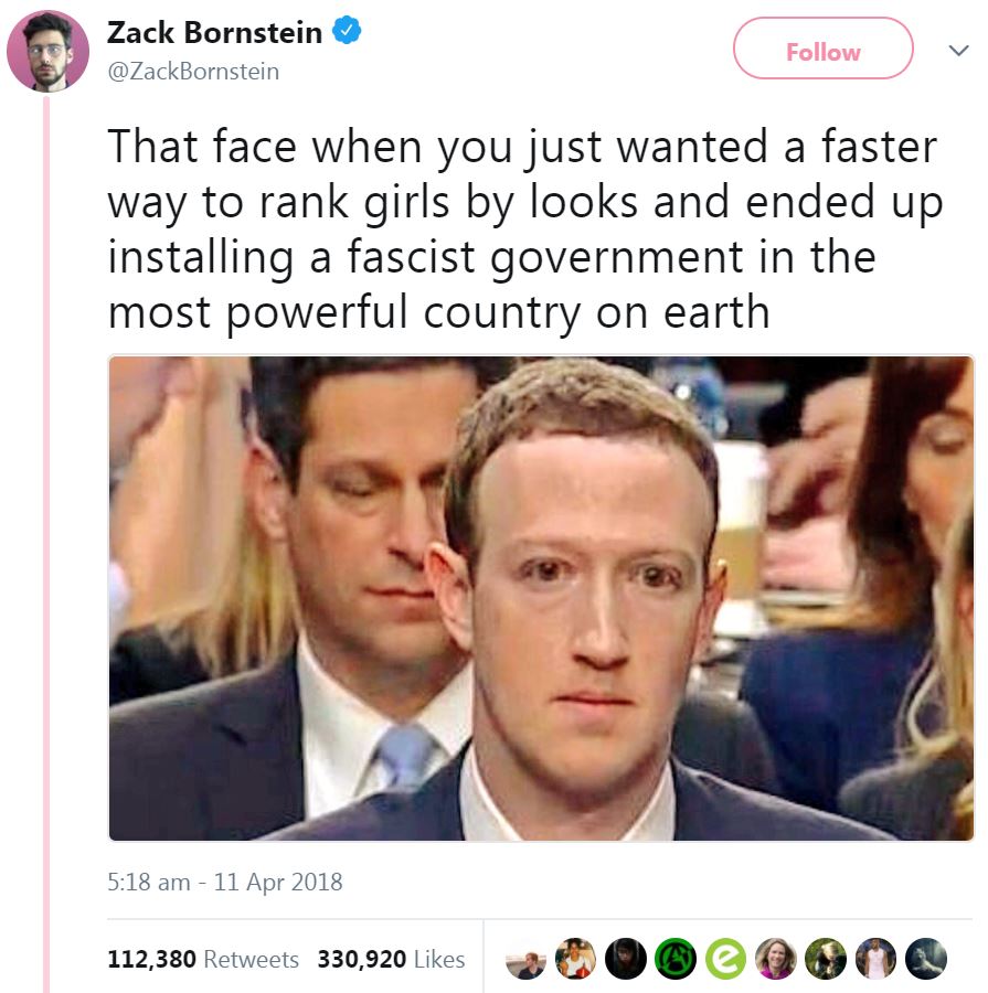 - Twitter users skew heavily left. Apart from tweets from Trump himself, I can’t think of many right-wing tweets that get more than 10,000 likes and 5,000 retweets. This one is approaching 180,000 likes and has over 60,000 retweets. This is merely an observation; I’m not insinuating there is anything underhand going on, like, God forbid, Russian bots or something else untoward rather than real people liking a real tweet from a real person. Good on Zack, who is a comedian, for being popular.