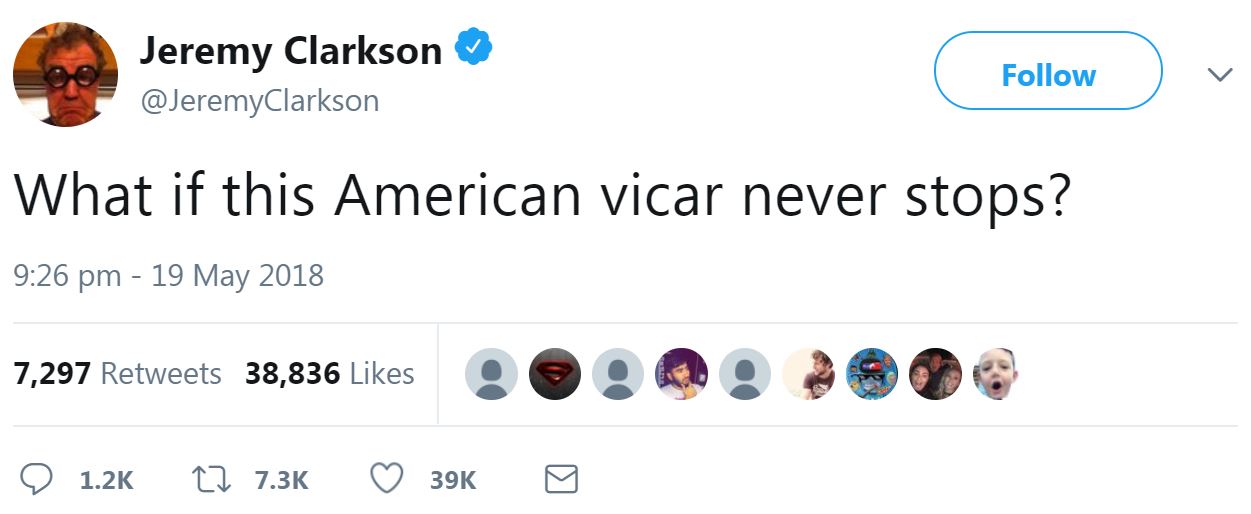 Putting all the alliterations and African-American ‘soul’ theatrics to one side, the content of Curry’s sermon has not only captured, but also divided, public opinion. On the one hand, Miranda Devine quite legitimately pointed out that it was a shrewd ecclesiastical exercise in Leftist identity politics. But on the other hand, Michael Jensen, argued that it was essentially orthodox, even if he did neglect to clearly articulate the most basic of Christian essentials. Whereas David Ould described it as something similar to a ‘car crash’. And then there was hard driving Jeremy Clarkson, who was just grateful that it all eventually came to an end, tweeting:
