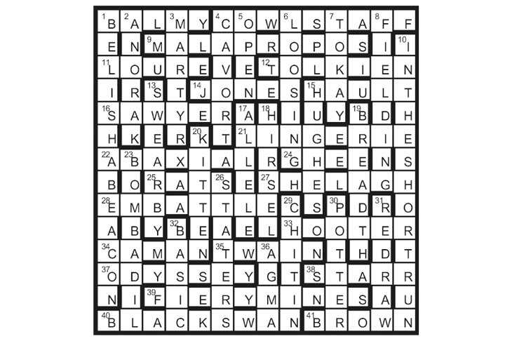 Unclued lights were five fictional TOMs and their authors: JONES (14A) and FIELDING (8D), SAWYER (16A) and TWAIN (35A), BROWN (41A) and HUGHES (15D), KITTEN (20D) and POTTER (30D), and BOMBADIL (23D) and TOLKIEN (12A).