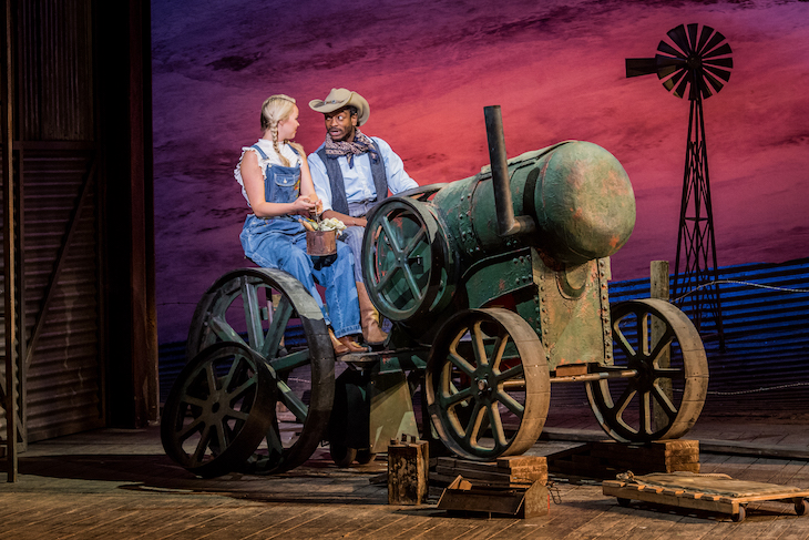 Oh, what a beautiful morning! In Jo Davies’s production of Oklahoma! the audience spends the overture staring at the side of a barn. Then, as birdsong rises from the orchestra, corrugated-iron doors slide open on a dustbowl farm of the 1930s. Aunt Eller (Claire Moore) is fixing a tractor, and a wind pump spins slowly against an orange dawn sky. It’s mildly surreal: the light falls as if in one of those New Deal-era western landscape paintings, with a jagged, David Smith-like sculpture of pitchforks and shovels serving as a tree. And then, with throwaway ease, Dex Lee as Curly launches into that greatest of all Broadway opening numbers.