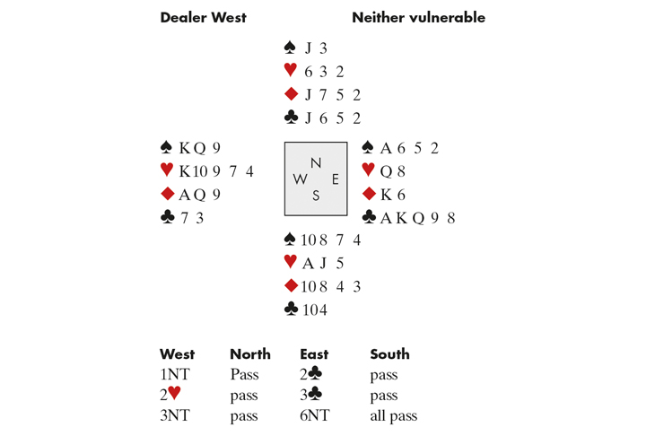 England was playing Estonia, who also reached 6NT and got the same 2 lead. Olavi Oja (West) won with dummy’s K, played a spade to the ♠K and a heart to the Q . England’s Chris Jagger won and returned a heart. Oja put up the K and cashed his winners outside clubs. (If clubs don’t break, this line works when North has Jx, and sets up a squeeze when spades are 3–3 and either defender holds four clubs and the J.) Unlucky — two down.