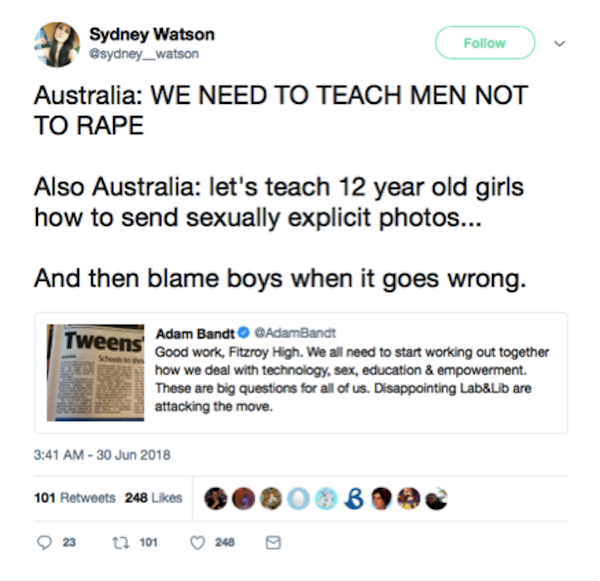 Can Bandt not see, though, the inherent inconsistency between the two things he has so enthusiastically thrown his support behind? How is sexting by twelve to seventeen-year-old girls not an example of ‘the objectification of young women’s bodies and the use of sexist language’? What’s more, does this not fuel the lust and violence of young men who would seek to take advantage of them sexually and psychologically?