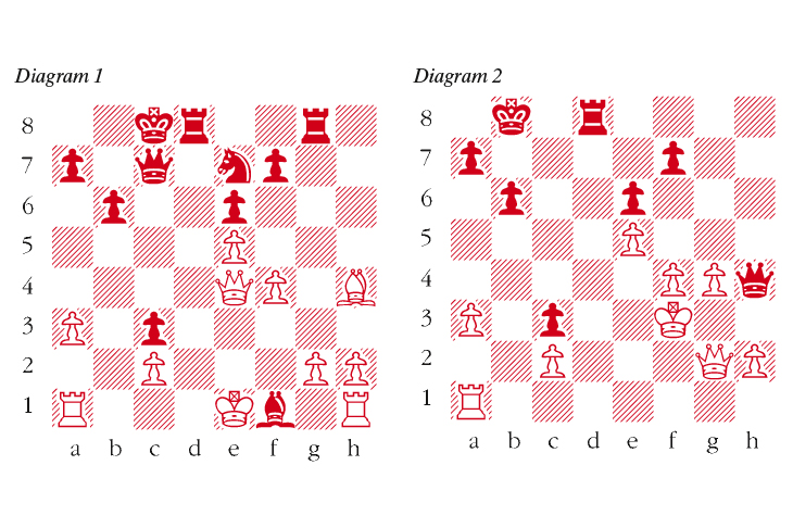 1 e4 e6 2 d4 d5 3 Nc3 Bb4 4 e5 c5 5 a3 Bxc3+ 6 bxc3 Ne7 7 Qg4 cxd4 8 Qxg7 Rg8 9 Qxh7 Qc7 10 Ne2 Nbc6 11 f4 Bd7 12 Qd3 dxc3 13 Be3 This is one of many moves that have been tried in this complicated position. Others are, for example, 13 Rb1 and 13 h4. 13 … d4 A further pawn sacrifice to seize the initiative. 14 Bf2 0-0-0 15 Nxd4 Nxd4 16 Qxd4 b6 17 Bh4 Bb5 18 Qe4 Bxf1 (see diagram 1) 19 Rxf1 Spassky could have forced a draw with 19 Qa8+ Kd7 20 0-0-0+ Nd5 21 Rxd5+ exd5 22 Qxd5+ Kc8 23 Qa8+ Kd7 24 Qd5+. 19 … Rd5 20 Bxe7 Qxe7 21 Rf3 Kb8 22 Kf1 Not 22 Rxc3 Qh4+ 23 Kf1 Rd2 winning. However, 22 g3 is also playable. 22 … Rd2 23 Rf2 Rgd8 24 Qf3 Rxf2+ 25 Kxf2 Rd2+ 26 Kg3 Qd8 This is a mistake. Black should play 26 … Rxc2 since after 27 Qd3 he has 27 … Rd2 28 Qxc3 Qd8 with a winning attack. 27 Qe4 Qg8+ 28 Kh3 Qh8+ 29 Kg3 Qg7+ 30 Kh3 Rd8 Threatening mate. Now White’s queen and rook develop amazing versatility and hammer White from all directions. 31 g4 Rh8+ 32 Kg3 Qh6 33 Qg2 Qh4+ 34 Kf3 Rd8 (see diagram 2) 35 Qg3 Better was 35 Rf1, planning 35 … Rd2 36 Rf2 when White should draw. 35 … Qe7 36 g5 This is a fatal error. 36 Re1 should still hold for White. 36 … Rd2 37 Kg4 Qb7 Spassky probably overlooked this when playing 36 g5. 38 Qxc3 Rg2+ 39 Kh3 Rf2 40 Kg4 Qe4 White resigns