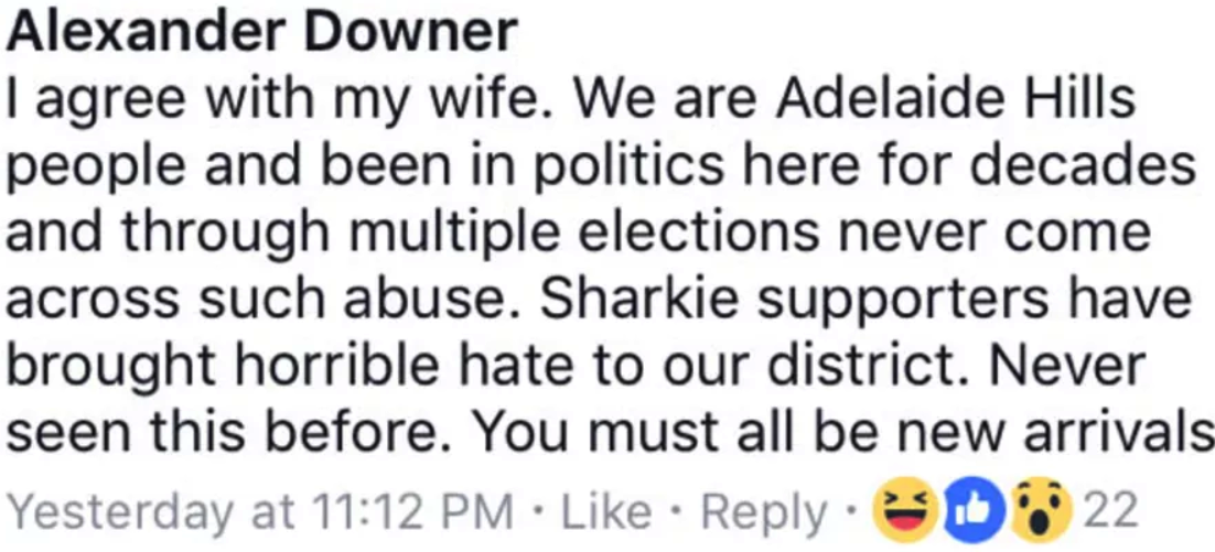 It all began when mum Nicky Downer asked the stout yeomanry of the Adelaide Hills to back her daughter in a closed local Facebook group on election eve.