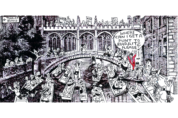 Sharing a plate of oysters with a three-year-old: where could this be but France, where children are brought up not to be faddish. The fads are for adults. It’s a relief to be away from Cambridge, where summer is bad for the soul. I find myself getting constantly annoyed: with suicidal cyclists, psychopathic taxi drivers, imbecilic pedestrians and double-decker buses allowed to hurtle through narrow streets belching diesel fumes. And hundreds of thousands of tourists trooping gormlessly up and down King’s Parade with not much to do. Here in Biarritz, the streets are calm, the traffic is regulated and people do not shout at each other in the street — a regular occurrence in Cambridge (and, mea culpa, one of the shouters is sometimes me). Biarritz is a town that lives by tourism and adapts to it. Cambridge has tourism dumped on it, and it fails to cope. Biarritz shows signs of having someone in charge. Whereas Cambridge is full of egos, has no sense of community, and its habitual summer state is one of nerve-jangling chaos. On the other hand, one doesn’t experience the sudden shock of seeing a squad of paratroopers in combat gear threading their way between the children with beach balls and the old ladies walking their chihuahuas.
