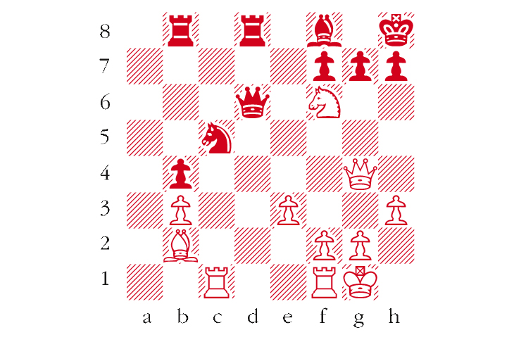 White to play. This is from Mamedyarov–Georgiadis, Biel 2018. Many of Mamedyarov’s games feature a kingside attack based upon a powerful bishop on the b2-square. Here, his next move led to a decisive increase in pressure against the black king. What was it? Answers to victoria@spectator.co.uk by Tuesday 4 September. There is a prize of £20 for the first correct answer out of a hat. Please include a postal address and allow six weeks for prize delivery.