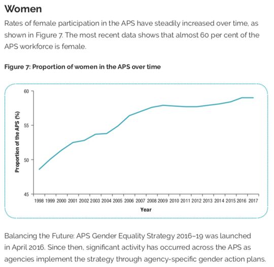 Ironically, we are already seeing a significant disparity in the Australian Public Service with the latest statistics showing that a significantly larger number of women are currently being employed over men. Just note the Australian Public Service Commission: State of the Service Report, 2016-17. On page 17 of the report is the following graph: