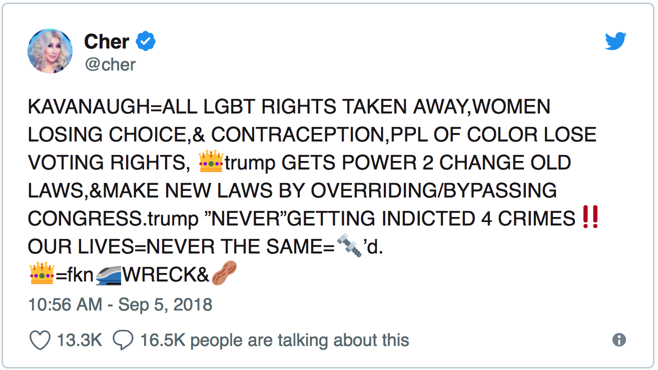 But the comment that gave the greatest insight into the LWLW (left-wing lunatic women’s) syndrome was that of the septuagenarian Cher, the pop star who recently expressed her opinion about the man seeking confirmation as the next Justice of the American Supreme Court, Judge Brett Kavanaugh. I would usually repeat it in full but it is an almost unintelligible combination of uppercase words run together with metaphorical emojis thrown in. Breitbart’s translation of part of it said: “Our Lives Will Never Be the Same If ‘F-cking Train Wreck’ Kavanaugh Confirmed.”