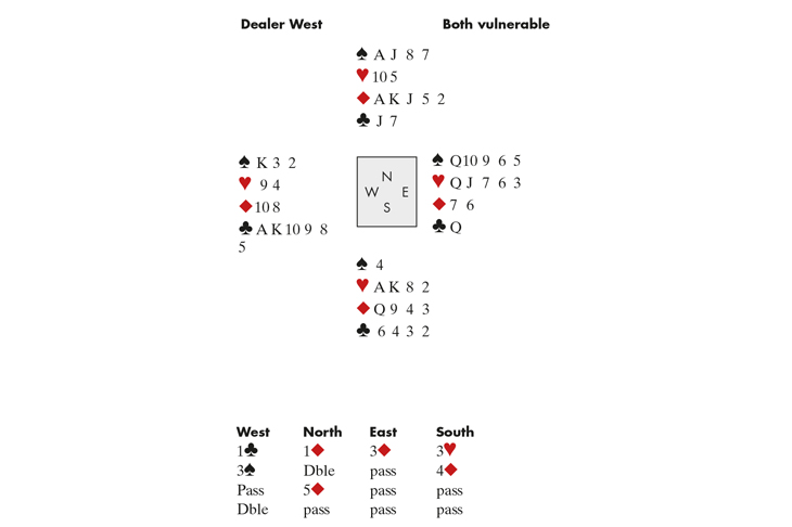 [3♦ showed both majors.] East (Lauria) led the ♣Q; Versace overtook and played ♣K and another. Ed ruffed with the ♦K, cashed the ♠A and ruffed a spade, drew two rounds of trumps and ruffed another spade. He now ruffed dummy’s last club and played his trumps; the last trump squeezed Lauria in the majors: he had to discard his ♠Q or bare his ♥QJ. Bravissimo!