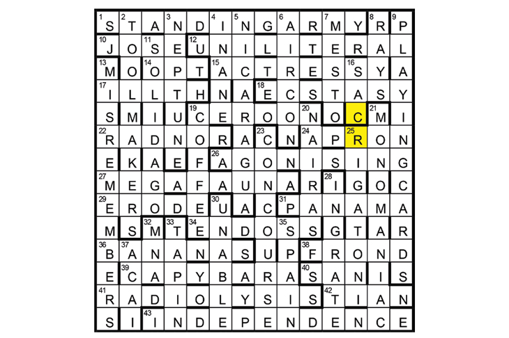 On 15 September, Costa Rica, bordered by PANAMA (31) and NICARAGUA (5), and whose capital is SAN JOSÉ (40/10), celebrated its INDEPENDENCE (43) from SPAIN (35). Its main exports are BANANAS (36) and COFFEE (19D) and, unusually, it has no STANDING ARMY (1). CR (in the twelfth column) was to be shaded.