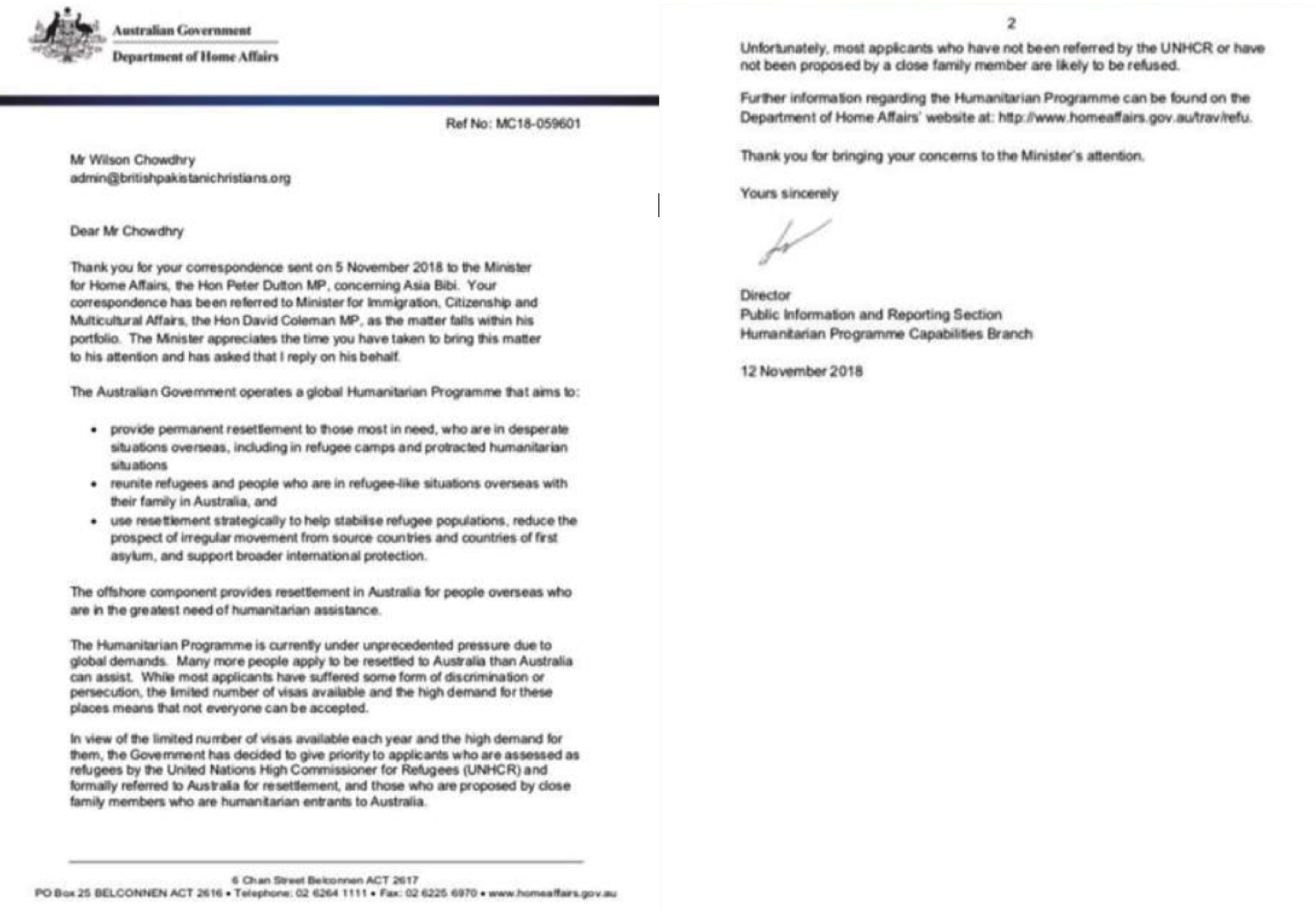 The Australian Government has refused to offer immediate asylum to Asia Bibi, the Christian woman falsely accused of blasphemy in Pakistan.