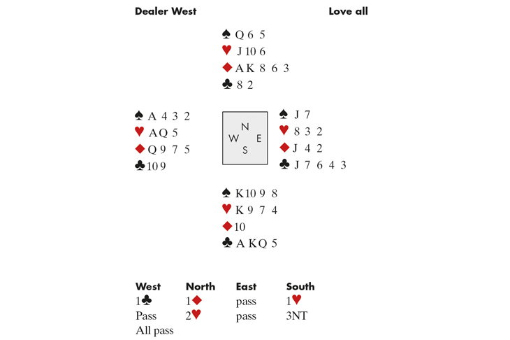 West (John Cox, playing on Cameron Small’s team) led the ♠2 to the ♠Jack and ♠King. Declarer returned the ♠10 at trick two, overtaking with the ♠Q when John ducked. Next South ran the ♥J from dummy, which Cox won with the Ace(!) and shifted to the ♦5 taken by the Ace. Playing for overtricks, which are important in the new(ish) form of Victory Point scoring rather than straight IMPs, declarer now fatally cashed the ♦K and took another heart finesse, safe in the knowledge that the Queen lay with East. John produced his ♥Q like a rabbit out of a hat and cashed his three winners (♠Ace, ♦Q and ♦9) for one down. The only other person to find the same defence was Andrew Black, but declarer – clearly not too worried about the VP scale — did not cash his ♦King and made the nine tricks he always had.