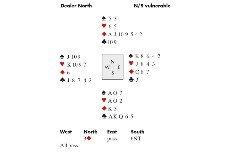 Obviously, the contract hinges on how the diamond suit is handled and how to reach dummy to enjoy them. If you play diamonds from the top, you will almost certainly go down if one of the defenders has ♦Q x x . You can’t play them from the top so you must play them from the bottom! If you lead the ♦3 to the Jack in dummy and East takes his Queen it’s game over. Clearly he must hold up, but if he does it’s still game over. You unblock the ♦King and play a low club to dummy, thereby creating an entry to the good diamonds and claiming 12 tricks. Merry Christmas, y’all.