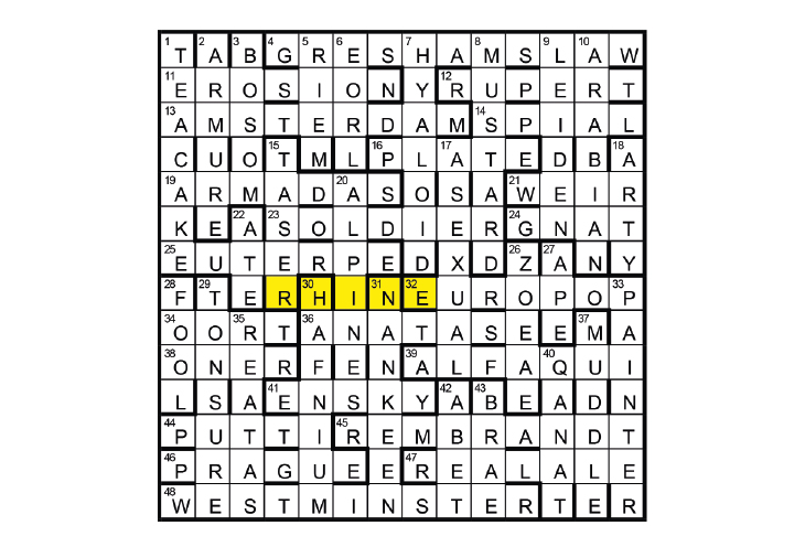 The two people were Prince RUPERT (12) of the Rhine, born 1619 in PRAGUE (6) and died 1682 in WESTMINSTER (48), a SOLDIER (23); and REMBRANDT (45) van Rijn, born 1606 in LEIDEN (9) and died 1669 in AMSTERDAM (13), a PAINTER (33). RHINE (in the eighth row) was to be shaded.