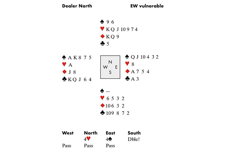 Zia’s partner opened a pre-emptive 4, and when East overcalled 4♠, Zia knew the opposition had slam on. And so he made the most perfect example of a ‘striped-tailed ape double’ I’ve ever seen. This is where the doubler hopes to deter the opponents from bidding on, knowing that the doubled overtricks will be less expensive than the bonus for bidding slam. If the double had been re-doubled, Zia would of course have run ‘like a striped-tailed ape’ to 5. It worked: West nearly fell off his chair, and passed. The slam was indeed cold — so conceding 1190 was better than 1430. Unluckily for Zia and his partner, many of the NS pairs bid to 7♠,  an excellent contract that only went down on the bad club break. Still, it was a brilliant double, and no one else sitting South had the chutzpah even to think of it.