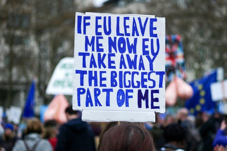 Other marchers boasted of their intellectual superiority to the ignorant masses who voted for Brexit. One had a placard saying ‘We ARE European’, followed up by ‘Trust me, I have a degree in geography’. Shame he doesn’t also have a degree in politics or history, because then he might have twigged that Brexit is about leaving the EU, an institution that has only existed since 1993, not Europe, a continent that has existed for donkey’s years. I saw a placard that said: ‘Ooh Look! Grammatically correct, properly spelt placards!’ Oof. Translation: we can spell, unlike those idiots who love Brexit. Other placards said ‘Think about the halloumi prices’ and ‘No Deal means Gucci will be even more expensive’. The lack of self-awareness — it’s breathtaking.