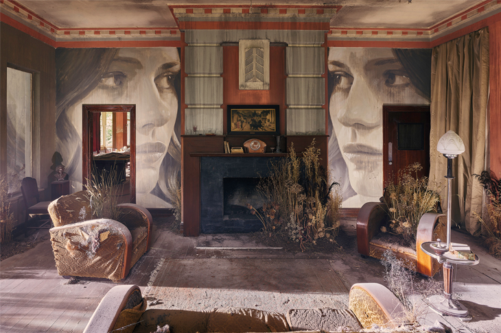 With its curvaceous walls and ample deck, the art deco Burnham Beeches has long been shut to the public, retaining legendary status amongst locals. When I meet Rone, on a cool, misty day, it rises out of Sherbrooke Forest like a great white ocean liner emerging over the horizon. Inside, it appears even more ghostly, as if the owners have just walked out. In every room are signs of decadence and decay. A large dining table is set but the silver – salt shakers, cutlery, an ornate pheasant – is covered in dust. Oyster shells have been chucked, along with half-burned candles, in the fireplace. Brown crisp leaves pile up in the corners under the spider webs and vegetation sprouts out of ripped leather chairs. Painted on the wall, gazing over it all, is the girl. She looks sad.