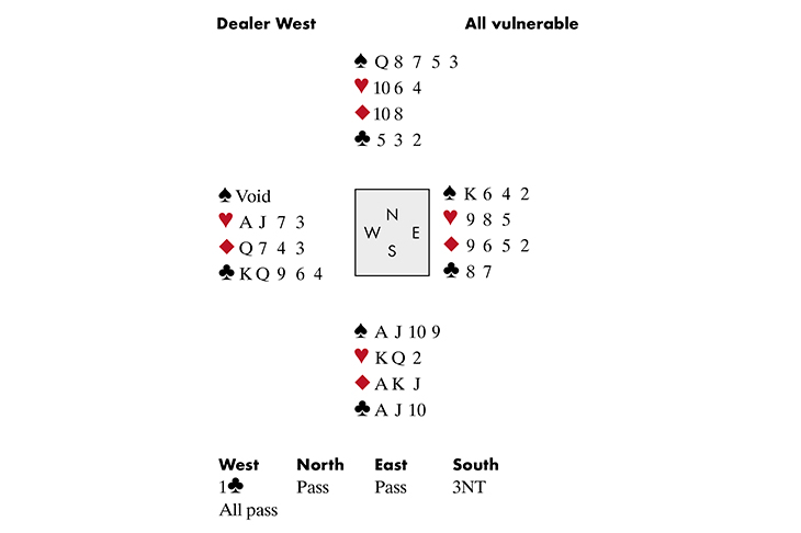 I was South and West led a small Club to my Jack. I laid down the ♠Ace and felt sick when West discarded a red card. Time for plan B: East had a King but did not respond — surely he can’t have another card? West opened 1♣, so he must either have 6 Clubs or be exactly 0–4–4–5. I cashed the Jack and 10 of spades, East ducking and West discarding a Diamond and a Club. Next I tried the ♥K, which West grabbed and played the ♣K to my Ace, East following. Now I knew West was 0–4–4–5. He had two good Clubs left, together with… eh… oh hell! What did West throw on the first Spade?