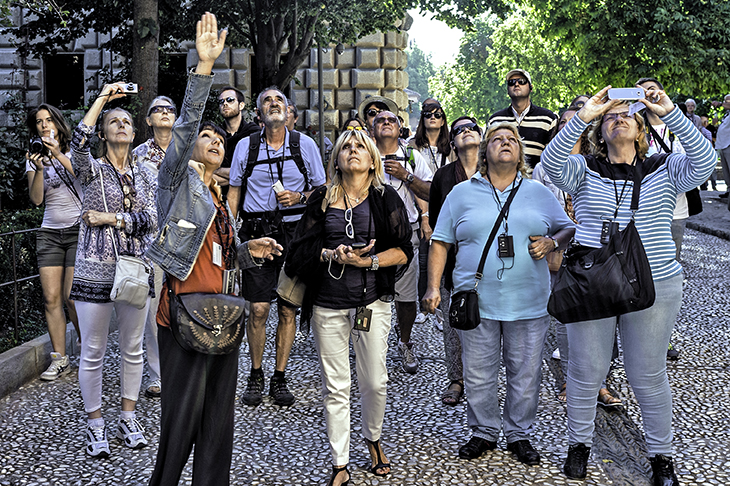 He was waffling on about God knows what, and was racking his brains for either a date or a word in English, when he noticed with benign annoyance that our attention had wandered away from his face and was transfixed by the sculptured eroticism, which was stunning. To recapture our attention he indicated a devilish face behind him that appeared to be leering at us over his shoulder. ‘I don’t know what is this,’ he admitted candidly. ‘It’s a satyr,’ said the best-looking woman of our party. He was astonished. ‘Is Satan?’ he said. ‘No,’ she said. ‘A satyr.’ Now he was panic-stricken at not knowing something that we all did. ‘What is this satyr?’ he said. The best-looking woman approached him, laid a caressing hand on his young shoulder and in a pantomime whisper said: ‘Santino. It’s all about sex.’ He went beetroot. ‘But I did not know this,’ he said angrily, suggesting that it was a downright scandal that he hadn’t been told.
