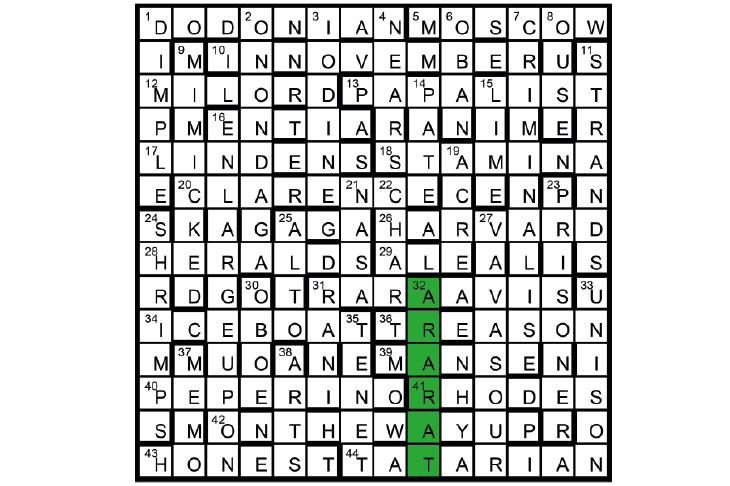 The first and second letters of the unclued lights are the same as the third and fourth ones. All the solutions are words or one phrase eight letters long. ARARAT at 32 Down matches the pattern but is only six-letters in length and had to be highlighted.
