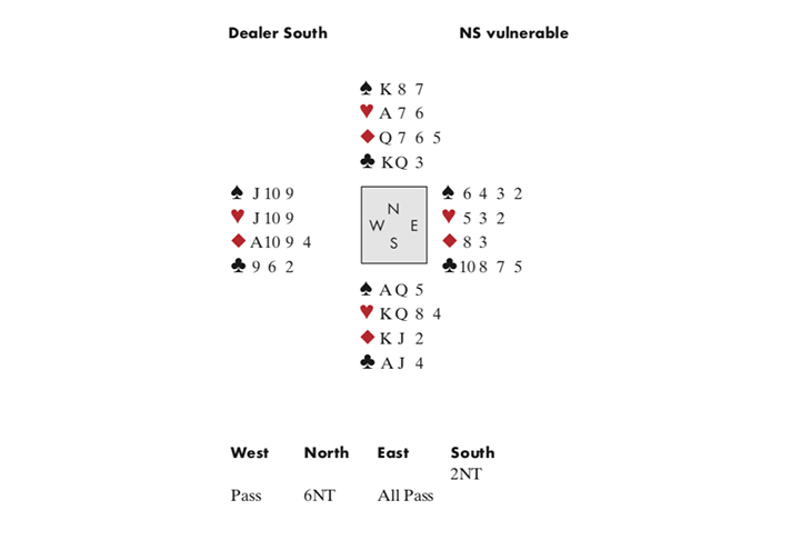 Collings was now in dummy, with ◆77 opposite Q8. He had a choice of going with the ‘principle of restricted choice’, which indicated finessing, or playing for hearts to be 3-3. He confidently played a heart to the Q, and the slam rolled home. Why did he not finesse? Because, he explained, West had paused slightly before his opening lead. If he had held ♠J109 and J9 he would have led the ♠J like a shot; the reason he hesitated must be that he held J109 in two suits!