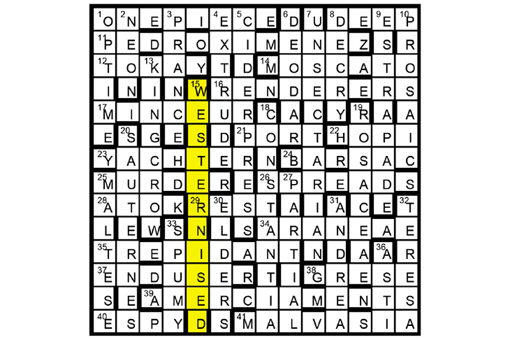 Unclued lights are all sweet wines. WESTERNISED, an anagram of DESSERT WINE, was to be highlighted.