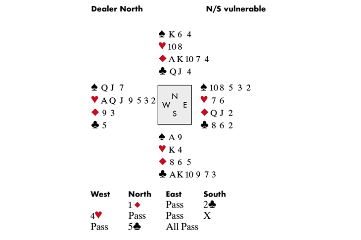 I thought of this story when today’s hand came up playing rubber bridge. Perhaps Jill would have made 5♣by losing a trick in a suit where she didn’t have a loser (see diagram):