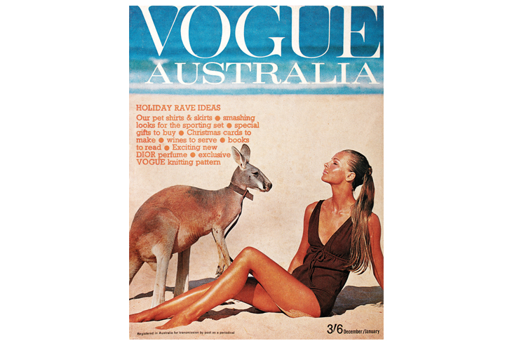 A kangaroo on the beach with a model was the unsubtle cover of Vogue in December 1965. It will be exhibited, with many other images, at the National Portrait Gallery in Canberra in Women in Vogue: Celebrating Sixty Years in Australia (opening October 11). I had started at Vogue just a month before that cover as a not particularly humble ‘Director of Finance.’ But on 30 October 1965, something really momentous happened: Jean Shrimpton, as guest of the VRC, attended Derby Day in a white shift with a hem four inches above her knees, wearing no hat, no gloves and no stockings. Instantly, women all over Australia felt unfashionable; the mini-skirt had arrived, everything changed. At Vogue Australia, editor-in-chief Sheila Scotter was not surprised. She had already published pictures from the Spring 1965 collection of André Courrèges, which ushered in the biggest change since Christian Dior’s New Look of 1947. It was a lively time to enter the world of publishing.