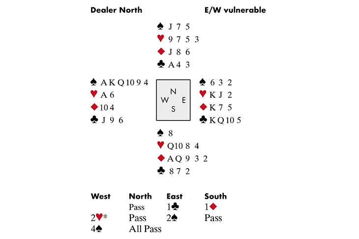 (*Transfer to ♠). Sitting South, I led the ♣7 (second highest from a poor suit). Catherine won with the ♣A and, in an imaginative flash, saw our only chance. If she could fool declarer into believing she had a doubleton diamond, declarer might ruff a third diamond high, fearing an overruff, which would promote Catherine’s J♠. So she continued with a deceptive J. Declarer covered with the K, I won, cashed the Q (Catherine playing low) and played a third diamond. Declarer, after a moment’s thought, ruffed with the ♠A — mission accomplished!
