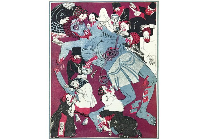 Blasphemous shock and awe were a major part of the Bolshevik aesthetic, which sought to show a still-pious nation just who was in charge. One memorable atheist illustration showed a worker climbing a ladder into the heavens above a landscape of shattered temples to smash the gods. It carried the caption: ‘We’ve finished the earthy tsars and we’re coming for the heavenly ones!’ A stylish lithograph from the same magazine showed a grisly parody of communion, with priests and peasants butchering the body of a dead Christ and eating his limbs and entrails. Some magazines ran photos of real holy corpses: the mummies and skeletons of Russian Orthodox saints which the Bolsheviks had exposed to debunk the popular belief that such relics didn’t decay.