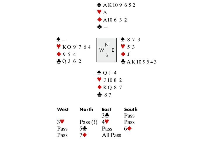 After East’s 3♣ pre-empt and West’s 3♥response, what would you bid? As you can imagine, Alex was the only North in the room to pass. Here’s his thinking: he didn’t want to bid 4♣ because, in his view, that should show the majors. True, West had bid hearts — but many players ‘psyche’ after a pre-empt from their partner, so Ben may still think he had the majors. Having decided there was no ideal bid, Alex decided to wait. Was there a risk East would pass 3♥? Not really: almost everyone plays that 3♣ –3♥ is forcing for a round. And Alex certainly wasn’t going to ask: ‘Only an idiot would ask if it’s forcing as then East could guess to pass.’ East raised to 4♥. When the bidding came back to Alex, he bid 5♣. As he explained, to go past 4♠ ‘must show the earth’: Ben got the point and jumped to 6♦. So Alex bid 7♦. They were the only pair to bid a grand slam.
