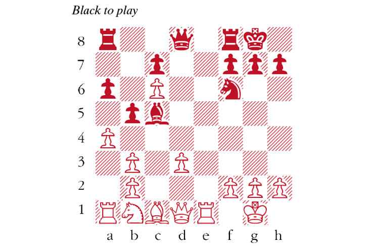 1 e4 e5 2 Nf3 Nc6 3 Bb5 a6 4 Ba4 Nf6 5 O-O Be7 6 Re1 b5 7 Bb3 O-O 8 a4 Instead 8 c3 d5 is the Marshall Attack 8…d5 Dubov’s gambit. Already there is a bewildering choice: 9 Bxd5 Nxd5 10 exd5 Nd4 11 Nxe5 Bb7 or 9 axb5 dxe4 10 bxc6 exf3 11 Qxf3 e4 both give Black good play. 9 exd5 Na5 10 Nxe5 Nxb3 11 cxb3 White would like to play 11 Nc6, but 11… Bg4! is a strong riposte. 12 f3 Bc5+ 13 d4 Nxd4!! is complex but ultimately good for Black. 11… Bb7 12 Nc6 Bxc6 13 dxc6 Bc5 14 d3 (see diagram) 14 d4 was better, returning a pawn to expedite development. 14… Bxf2+! 15 Kxf2 Qd4+ 16 Be3? A decisive error. White could walk a tightrope to the draw with 16 Kg3. 16… Ng4+ 17 Kf3 Nxe3 18 Rxe3 Rae8 19 Re2 19 Qd2 Rxe3+ 20 Qxe3 Qxb2 21 Ra3 b4! embarrasses the rook. 19… Qf6+ 20 Kg3 g5! 21 Rf2 Qd6+ 22 Kh3 Qh6+ 23 Kg4 Qh4+ White resigns (in view of 24 Kf5 f6 with Re8-e5 mate to follow).