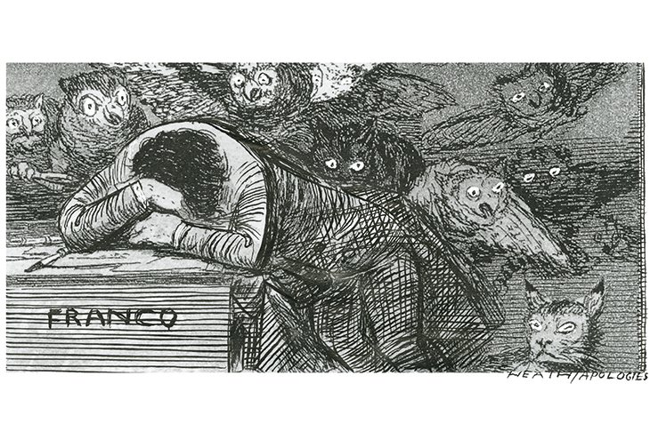 I was no sooner in Madrid than General Franco was exhumed from his mausoleum not far from El Escorial. An air force helicopter ferried his remains from the Valley of the Fallen, where a gigantic stone cross marks the dictator’s grave as well as that of 34,000 Spanish Civil War dead. For four decades the dictator had lain beneath a 1.5 ton granite slab. No longer. As eight of his descendants shouldered the coffin to the helicopter, shouts went up of ‘Viva España! Viva Franco!’ from Falangist diehards behind a police cordon. Franco was reinterred the same day alongside his wife, Carmen Polo, in a family pantheon 20 miles away. The exhumation was a symbolic triumph for Spain’s socialist government under Pedro Sánchez, which has long argued that the Valley of the Fallen glorifies the generalísimo at the expense of the thousands in unmarked graves from the 1936-39 war. The elimination of the last great symbol of Spain’s dictatorship may help to win votes for Sánchez in the general election on Sunday.