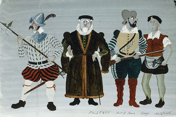 Those 30 years between the Alhambra and his first designs for Sadler’s Wells were not wasted. All the while, he was observing, sketching, taking notes for future sets, props and, especially, costumes. Osbert Lancaster (1908–86) was a prep-school dandy. On Sundays at St John’s in Notting Hill he had loved the catwalk of the nave: the feather boas, veils, gloves and that must-have accessory — the prayer book. He knew his epaulette from his plastron, his aiguillette from his astrakhan. He could tell a cap badge at 40 paces. At Charterhouse, the school of William Makepeace Thackeray, John Leech and Max Beerbohm, he had chaffed against schoolboy ‘sumptuary laws’. The headmaster waved him off as ‘irretrievably gauche’ and ‘a sad disappointment’. Between Charterhouse and Oxford, Lancaster grew a moustache. ‘Half Balkan bandit, half retired Brigadier,’ said one later friend. It was, Lancaster admitted, ‘a compensation for something or other, but don’t ask me what’.