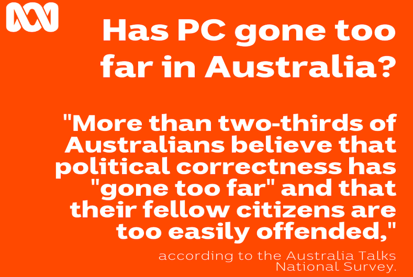 According to the skewed Australia Talks National Survey (we dismembered its methodology here), two-thirds of Australians agree that political correctness has gone too far.